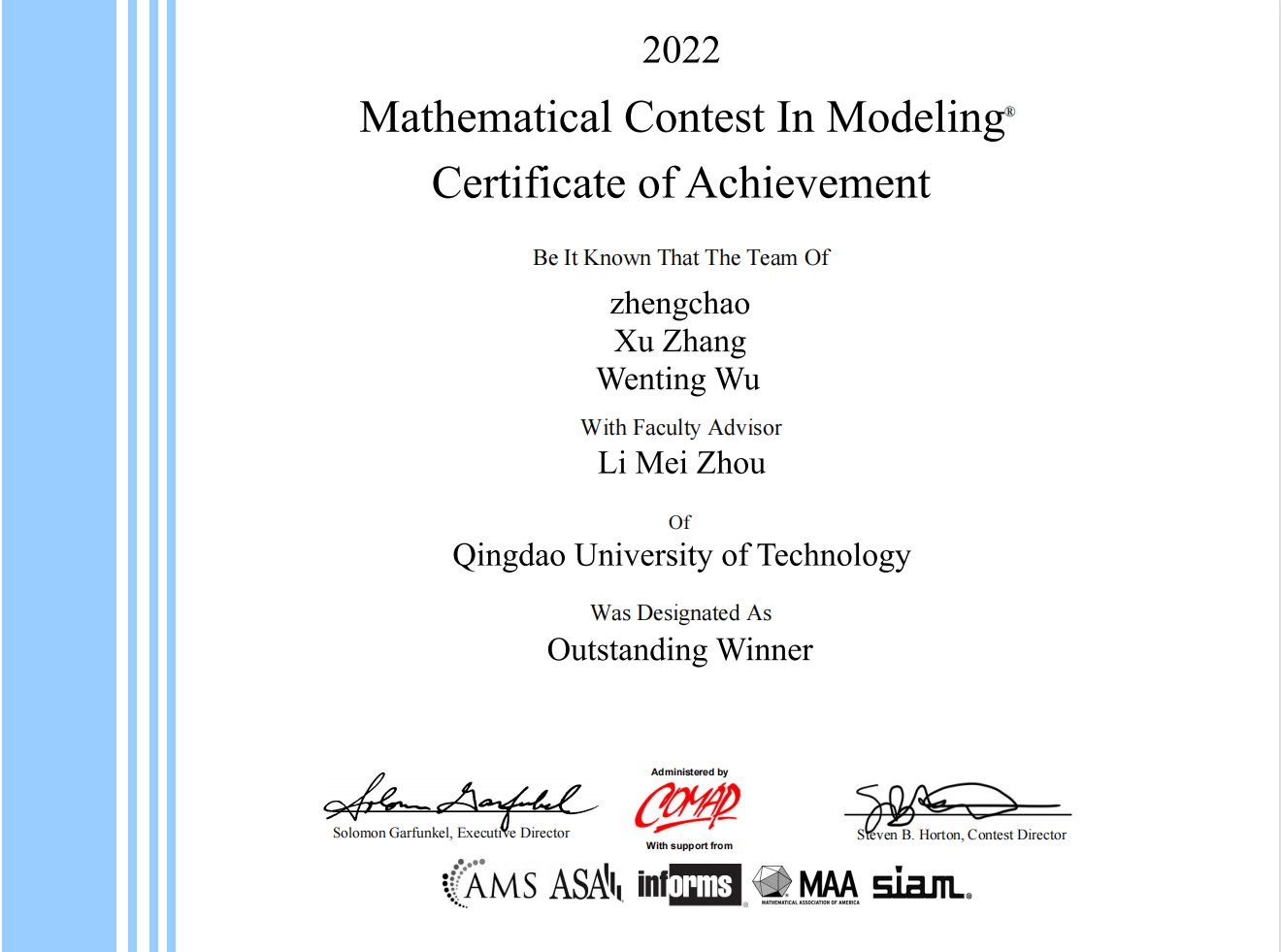 美国大学生数学建模竞赛获最高奖项:近日,2022年美国大学生数学建模竞赛(MCM/ICM)成绩正式公布,商学院2020级统计学专业吴文婷同学所在团队获得该项比赛的最高奖项——特等奖(Outstanding winner。
