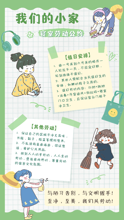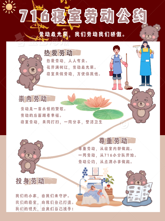 以劳为约,建章立制有保障。举办“我们的小家”寝室劳动公约设计大赛,通过制定劳动公约、创建“标准宿舍”等系列举措,在美化起居环境,创建文明寝室的同时,深化劳动育人观念,推进宿舍文化建设与劳动教育相结合,引导学生在动手实践的过程中树立崇尚劳动,尊重劳动,热爱劳动的劳动观,让寝室也成为思政“大舞台”。