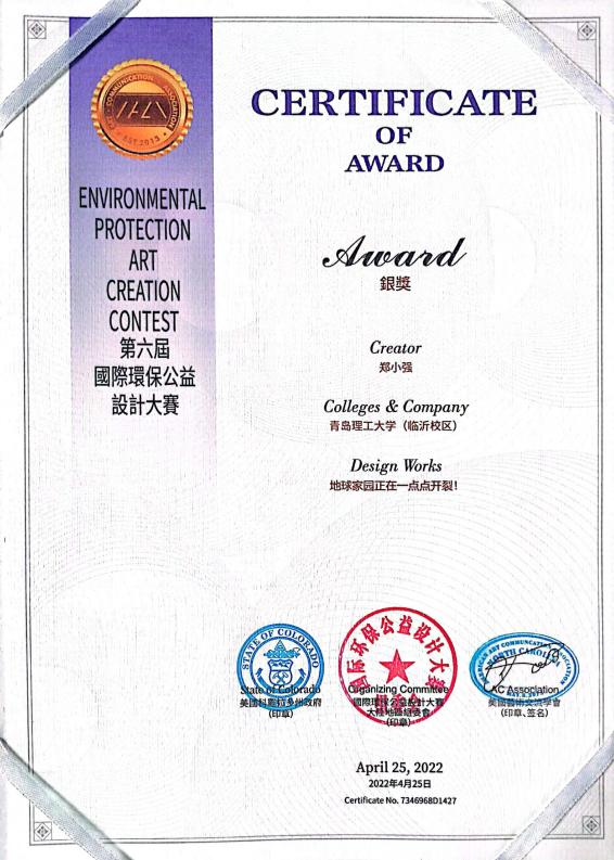 作为一项国际性的公益类设计赛事。比赛自2021年10月启动以来,在中国、美国、加拿大、新西兰同时开赛,涉及视觉传达设计、工业产品设计、环境艺术设计,并强调材料重组、绿色环保等新型创作方式。凭借创意独特、主题鲜明的作品,临沂校区土木与建筑工程系教师郑小强提报的《地球家园正在一点点开裂》荣获银奖,《父亲的手套》《一口唾液一口泥》荣获铜奖。