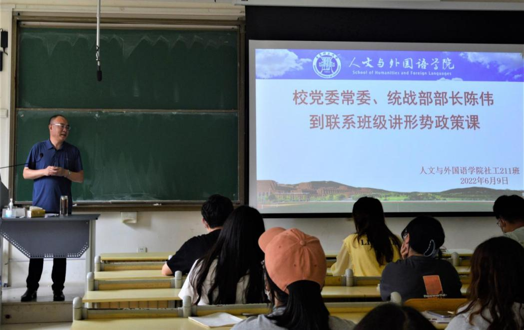6月9日下午,党委常委、统战部部长陈伟来到联系班级人文与外国语学院社工211班为全体同学讲形势政策课。人文与外国语学院有关负责人和社工211班全体同学聆听这次形势政策课,学院党委书记卢新明主持本次学习活动。