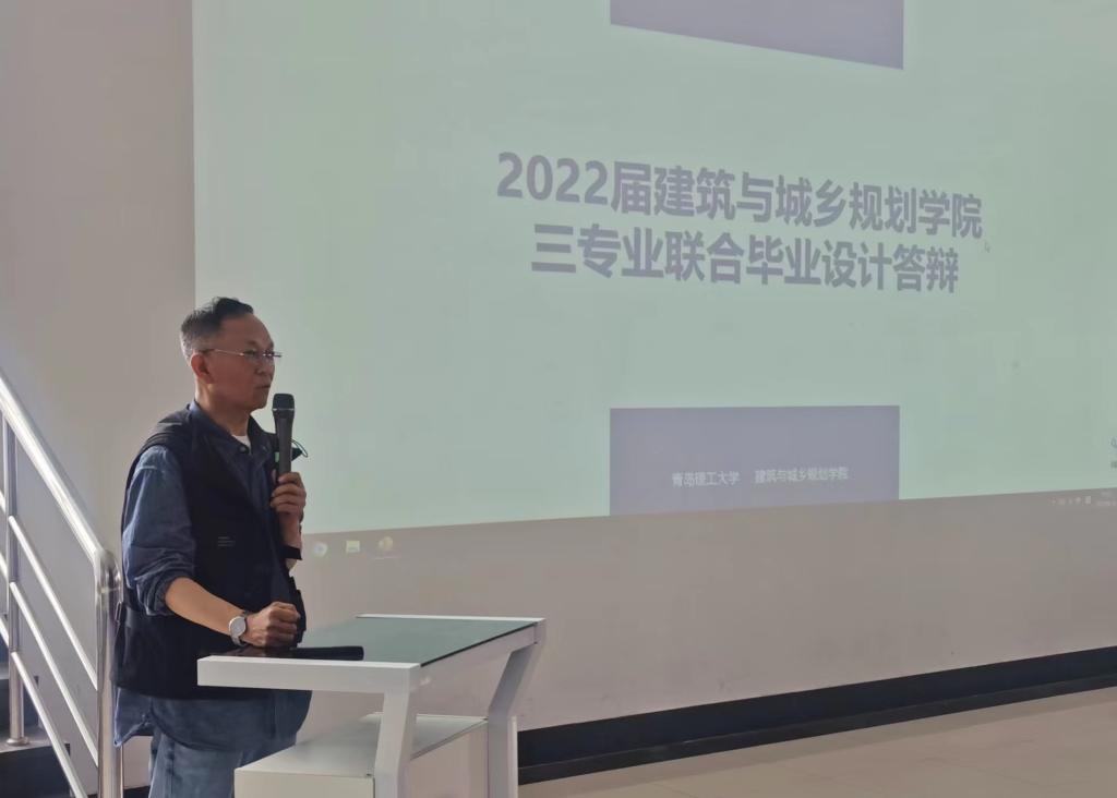 6月14日,2022届建筑与城乡规划学院毕业生建筑学、城乡规划、风景园林三专业联合毕业设计公开展评及答辩在建筑馆二楼展厅圆满举行。此次展评由青岛腾远设计事务所有限公司执行总裁王震铭先生、青岛理想城市建筑设计有限公司总建筑师绳兵先生、青岛腾远设计事务所有限公司规划院院长陆泉先生、山东龙跃兴设计集团副总经理李彩民先生、建筑与城乡规划学院博士生导师郝赤彪教授等多位业内知名专家、教授担任评委。学院党委书记肖学斌、副院长解旭东以及联合毕业设计全体师生出席开幕式,建筑系程然副教授主持开幕式。