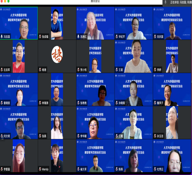 8月16日上午,人文与外国语学院举行2022年秋季学期课堂教学改革培训交流会。学院课堂教学改革工作小组全体成员、秋季学期参与课堂教学改革的7门课程团队教师、校院两级教学督导及临沂校区基础部教师共计68人参会,会议通过腾讯会议的方式举行,学院院长巩湘红主持会议,会议持续两个半小时。