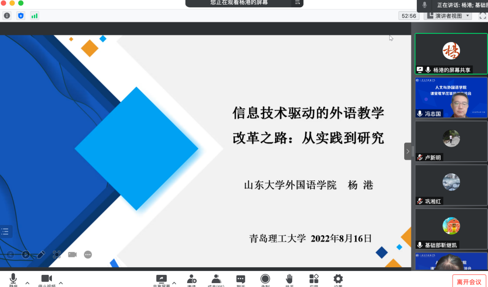 会议开始,巩湘红对学院课堂教学改革实施背景和意义进行了介绍,强调了此次课堂教学改革的重要性,期望所有参会教师积极参与课堂教学改革,为学校人才培养模式改革贡献力量。随后,山东大学外国语学院副教授杨港受邀为全体参会教师进行了题为“信息技术驱动的外语教学改革之路:从实践到研究”的专题报告。报告从信息技术与课堂深度融合的角度回顾了我国高校外语教学信息化改革历程,概括了信息化外语教学发展脉络,从梳理国内外相关研究的整体特征和重要发现展望信息时代大学外语教学转向与研究前沿;同时,结合实例分析,归纳基于信息化外语教学的研究设计论证和论文写作方略,探析实践和研究双重视角下外语教学信息化改革路径。