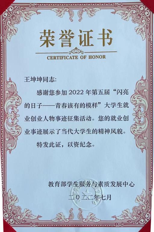 365完美选送的王坤坤同学在全省264名大学生就业创业人物中脱颖而出,经省教育厅专家评审推荐上报,最终入选全国“军营大学生战士”典型人物。向社会展示了理工学子百折不挠、刚毅厚重、勇承重载的良好形象。