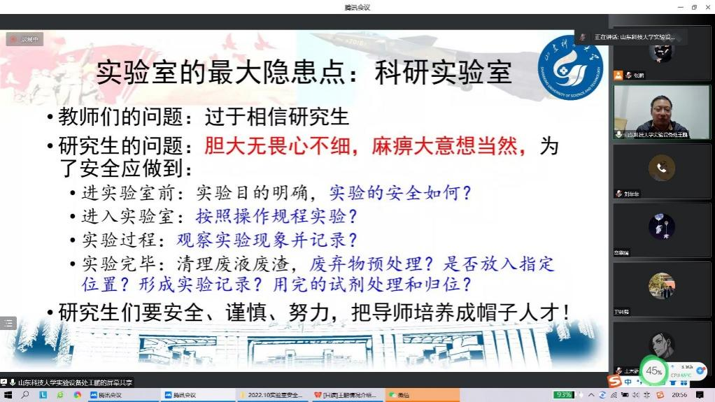 面向全院研究生开展安全规范使用实验室线上培训。10月12日,学院举办了关于安全规范管理和使用实验室的线上专题培训会,邀请山东科技大学实验室管理处副处长王鹏作报告,学院院长侯东帅、副院长张鹏出席会议。培训报告以部分实验室安全事故为例,详实讲解了如何做到实验室安全规范管理,如何做好实验室安全防范及应急处置工作。本次培训会通过案例式教学,切实提高了广大师生的实验室安全管理意识。