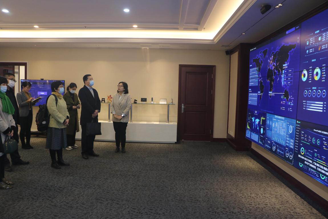 在中译语通科技(青岛)有限公司语言科技事业部总经理吕倩带领下,卢新明一行参观了该公司的科技展厅。吕倩详细讲解了目前与高校合作的育人项目、公司自主研发的高科技产品和大数据收集平台,并现场演示了多语同传翻译软件。