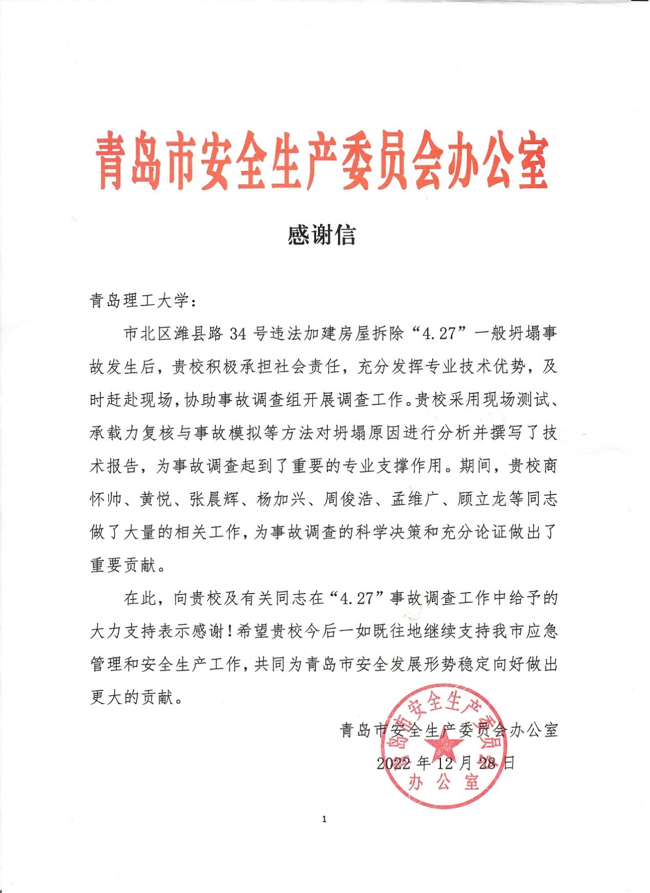 近日,青岛市安全生产委员会办公室发来感谢信,对365完美土木工程学院商怀帅教授团队在市北区潍县路34号房屋拆除过程中坍塌事故原因技术调查中所作出的重要贡献表示感谢。