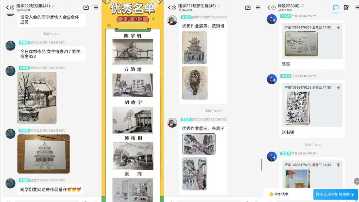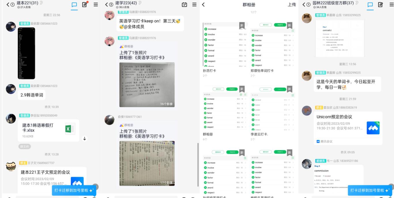 多措并举,营造向上氛围。学习氛围是提升学习效率和效果的重要因素,而寒假在家学习最缺少的就是学习氛围。为此,学院开展了优秀作业展示、复习笔记展示、每日词卡来提升“线上学习”氛围感,营造比学赶超的良好氛围。活动期间,各班班委将优秀作业、学习笔记和每日的单词打卡在规定时间上传至群相册,帮助同学们在互相学习的同时,促进班内同学对照差距找不足,激发学习内生动力,提升短板弱项。“学习打卡等线上活动营造了一起学习的氛围,自己的作业被多次在群里展示很开心,学习更有动力,通过这种互助式监督,大大提升了自己的复习效率”来自建学222班的刘森同学说。