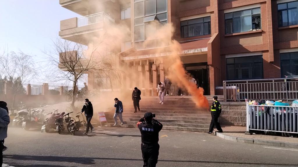 随着一声消防安全演练指挥令下,一场紧张逼真的逃生疏散演练拉开帷幕。一时间,模拟着火点冒出滚滚浓烟,楼内学生发现火情后迅速反应,在安全管理处工作人员和老师的组织下有序疏散撤离。