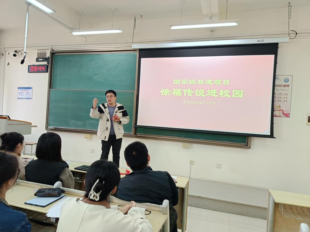 丁盛华在宣讲中讲解了“徐福传说”的基本情况以及自己利用所学专业知识传承、传播该项目的过程。他从快板入手,为同学们表演了快板的“开场板”,即兴表演了一段快板来“说唱”徐福传说。他还为同学们播放了快板说唱“徐福传说”的短视频,华美的阵容、悦耳的声音、精彩的叙事让同学们加深了对徐福传说的了解。