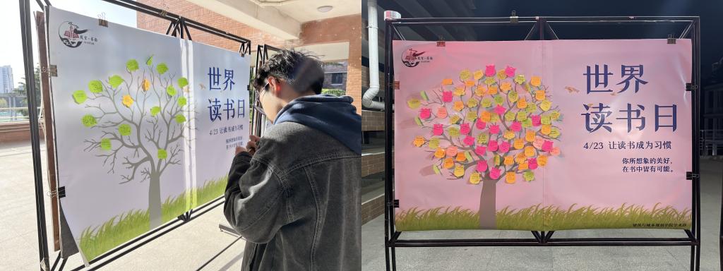 线上线下结合,营造良好读书氛围。在建筑馆门口,设置“读书树”海报,同学们精心挑选自己最喜欢的书目,用树叶形状的便利贴装点树干,一起创作一幅枝繁叶茂的书籍大树。来自学院主持人队的18位同学,选择了20位名家描写春的名句,为“谷雨诗会”活动录制了宣传视频。“春天像刚落地的娃娃,从头到脚都是新的,它生长着。——朱自清《春》”,同学们漫步在花海中深情朗诵,每位同学感情丰富,精神饱满,演绎着经典文章中的最美精华,用丰富多彩的形式给同学们以美的享受和传统文化的熏陶。