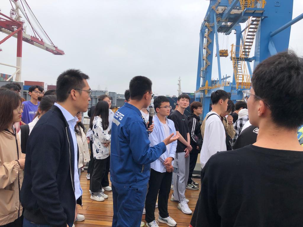 师生代表参观了山东港口青岛港自动化码头“国家交通运输科普基地”、“全国爱国主义教育示范基地”、“连钢创新团队”展馆,张常江给师生们介绍了山东港口青岛港自动化集装箱码头,“码头是从从一片滩涂起步的,技术、设备、人员都是从零开始”经过年的努力,青岛港自动化集装箱码头已经成为融合大数据、物联网、云计算、5G、人工智能等先进技术,在自动导引车循环充电技术、大型机械“一键锚定”等方面实现自主创新,不断刷新自动化码头装卸效率世界纪录的全自动集装箱码头,“我在青岛港自动化集装箱码头的建设故事中看到了科技的力量,更看到了码头建设者们敢想敢干、勇攀高峰的精神”学生刘德苗说道,目前,她正在准备自动化专业研究生考试:“希望我以后也能成为建设者之一”。