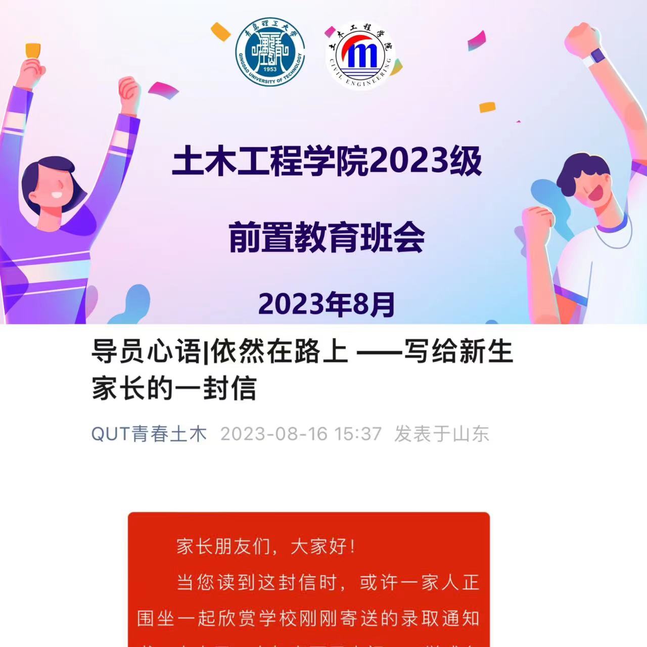 土木工程学院在2023年高考录取结束之际,组织开展了“未入校,先知校 ”系列入学教育前置活动,以“大学生礼仪教育”“致毕业时的自己一封信”“给新生家长一封信”“我和录取通知书有个合影”等主题迎新活动,引导新生感受大学文化魅力,掌握学习生活技能,厚植家国情怀,实现入学前后教育的顺利衔接。