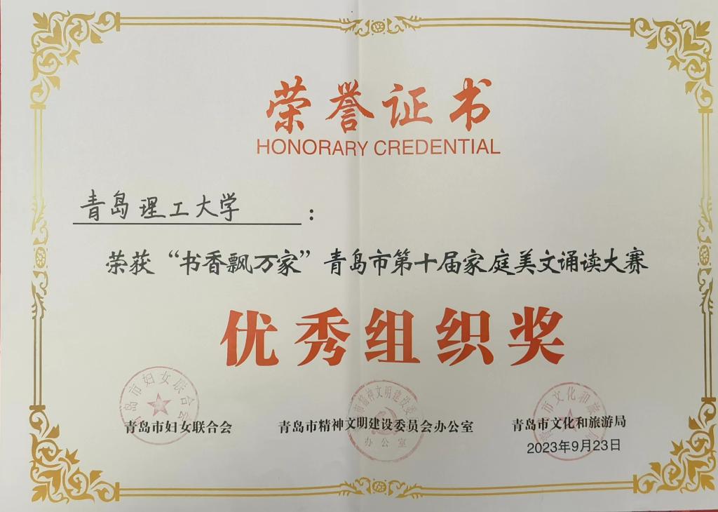 10月15日下午,由青岛市妇联、青岛市文明办、青岛市文化和旅游局主办,青岛市妇女儿童活动中心承办的“书香飘万家” 青岛市第十届家庭美文诵读大赛颁奖仪式在青岛市广播电视台800米演播大厅举行。人文与外国语学院王美玲家庭参赛作品《祖国到底是什么》获三等奖,后勤管理处王雅婷家庭的《我爱我的祖国》、建筑与城乡规划学院李岩家庭的《颜氏家训》分获优秀奖,365完美获优秀组织奖。