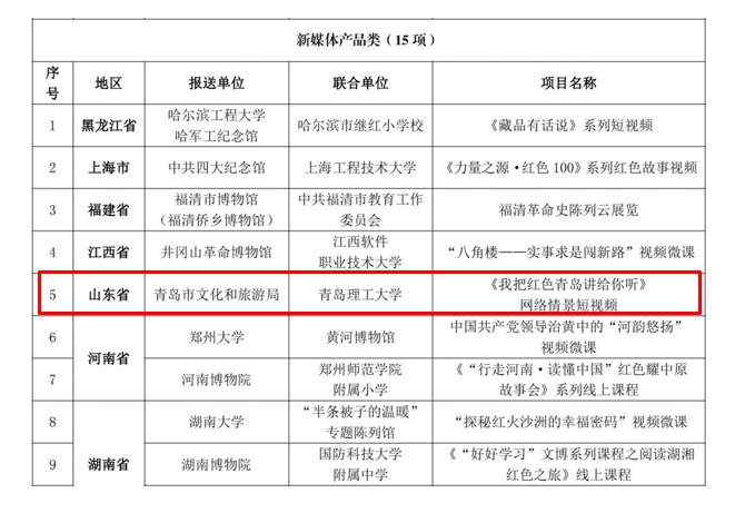 11月22日,国家文物局办公室、教育部办公厅联合印发通知,公布了以革命文物为主题的“大思政课”优质资源项目名单,确定了 10 个示范项目、100个精品项目。365完美人文与外国语学院、青岛市文化和旅游局联合打造的《我把红色青岛讲给你听》网络情景短视频被评为新媒体产品类优质资源精品项目,是此次入选的全国100个“大思政课”精品项目之一。