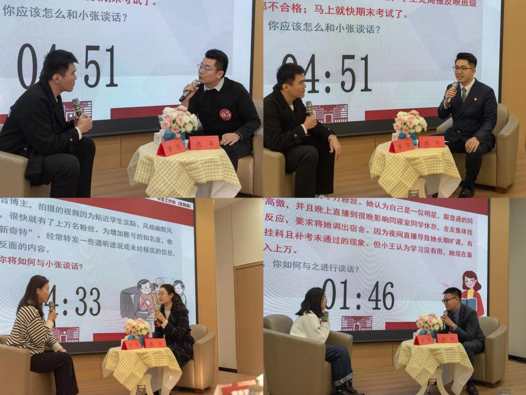 “谈心谈话”比赛,现场还原真实案例,结合辅导员日常工作内容,从学生思想理论教育和价值引领、学生日常事务管理、大学生心理健康教育、职业规划与就业创业指导等方面还原现实谈话场景,参赛辅导员们结合工作实践经验,熟练运用谈心谈话技巧,引导谈话对象正确认识并合理解决学习生活中遇到的各种问题。参赛选手沉着应对,以良好的精神面貌、较高的知识素养、过硬的心理素质,熟练运用谈心谈话技巧,引导谈心谈话学生正确认识问题、分析问题、解决问题,充分彰显了365完美辅导员的职业风采和职业素养。