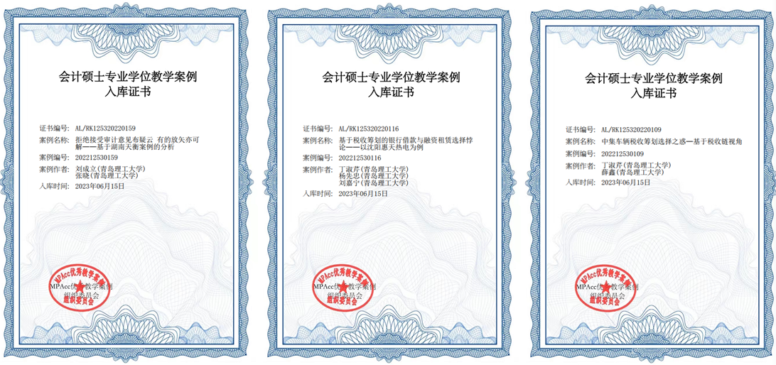 入选的案例分别是刘成立教授和2019级工商管理学术硕士张晓开发的《拒绝接受审计意见布疑云有的放矢亦可解——基于湖南天衡案例的分析》、丁淑芹副教授和2022级会计专业硕士杨先忠、刘嘉宁开发的《基于税收筹划的银行借款与融资租赁选择悖论——以沈阳惠天热电为例》以及丁淑芹副教授和2020级会计专业硕士薛鑫开发的《中集车辆税收筹划选择之惑——基于税收链视角》。