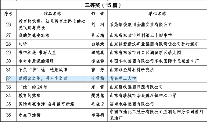 近期,由红旗出版社、中国妇女报社、人民网、全国总工会女职工委员会组织的第十一届“书香三八”读书征文活动中,人文与外国语学院辛雪梅老师的征文《以阅读之炬,明人生之盏》荣获全国优秀奖、山东省总工会“ 玫瑰书香 ”女职工主题阅读优秀作品三等奖。