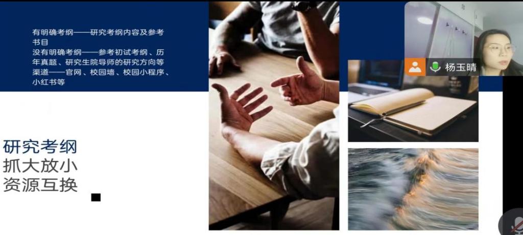 优秀校友经验分享,明确目标方向。近期,学院开展线上考研复试培训,邀请2017级优秀毕业生、现就读哈尔滨工程大学翻译专业学生杨玉晴进行考研复试经验分享。杨玉晴根据自身经验从专业知识、英语口语技巧、心态调整、常见问题等方面进行详细地讲解。在模拟复试环节,杨玉晴担任面试官,按照英语口语面试、自我介绍等环节对考研学生进行一对一分析指导,让备考学生沉浸式体验研究生复试面试全过程。考研同学高海容表示,通过此次经验分享,不仅掌握了复试的方法、技巧,也充分认识到自身的不足和问题,接下来将针对本次模拟发现的问题进行查漏补缺,以更充分的准备迎接即将到来的考研复试。