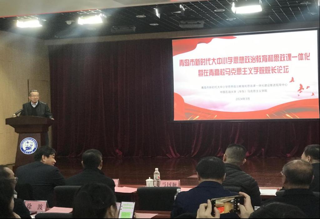 3月23日,“青岛市新时代大中小学思想政治教育和思政课一体化暨在青高校马克思主义学院院长论坛”在中国石油大学(华东)举行。此次论坛汇聚了青岛市新时代大中小学思想政治教育和思政课一体化建设推进指导中心领导成员、全市各大中小学思政课一体化建设共同体单位负责人、各高校马克思主义学院院长、师生代表等200余人,马克思主义学院党总支书记陈国庆、院长华章琳、院长助理石峰、史倩教授受邀参加。