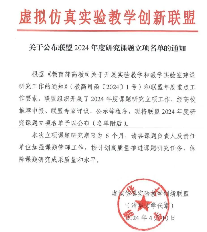 虚拟仿真实验教学创新联盟在教育部高教司的指导下,致力于开展虚拟仿真实验教学的研究、咨询、指导、评估和服务工作。联盟旨在推进现代信息技术与实验教学项目的深度融合,提升实验教学的质量和水平,并推动形成专业布局合理、教学效果优良、开放共享有效的高等教育信息化实验教学项目新体系。此次成功立项联盟研究课题,不仅是对学校虚拟仿真实验工作的认可,也是对学校虚拟仿真实验创新能力的肯定。
