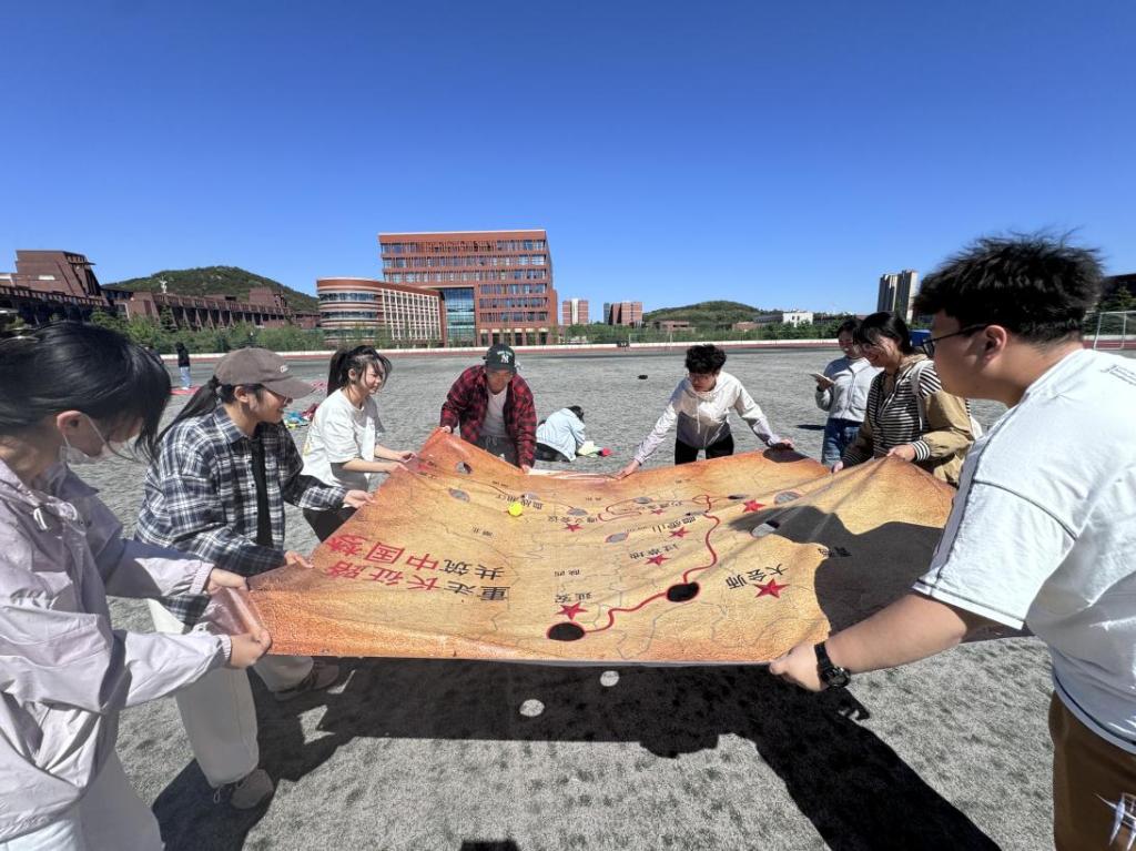 谱奋斗华章,奏响心理素质拓展进行曲。辅导员辛雪梅设计开展了“重走长征路”“战地运粮”“执笔画新长征”等体验活动,参赛队伍以小组为单位,自行完成战斗小组文化建设。每个小组在一张张长征画布、一个个网球、一段段“运粮”中重走“长征路”,沉浸式体验“爬雪山”“过草地”“激战腊子口”。“我感受到了队员们的拼搏精神,用这种独特的方式重温了那段峥嵘岁月,让从小生活在和平年代的我们,感受了当年红军长征路上的艰辛。”学生党员公绪健说道。