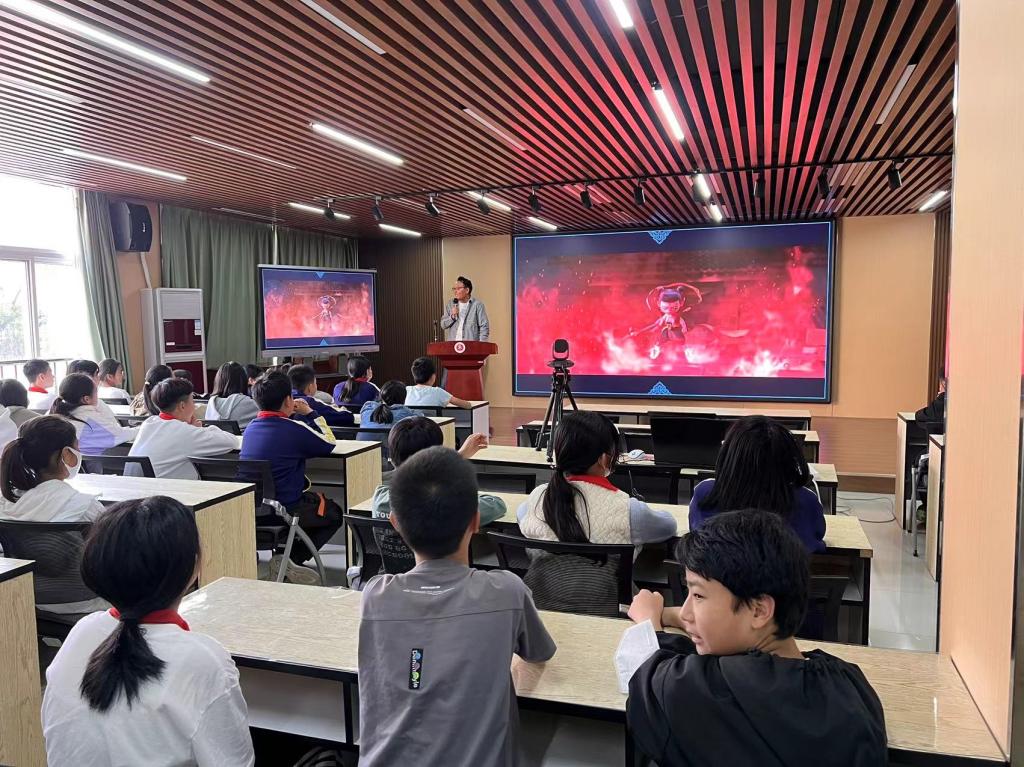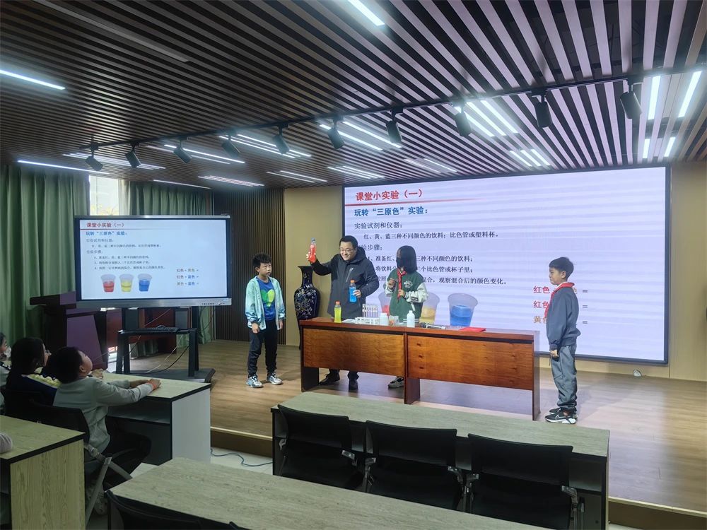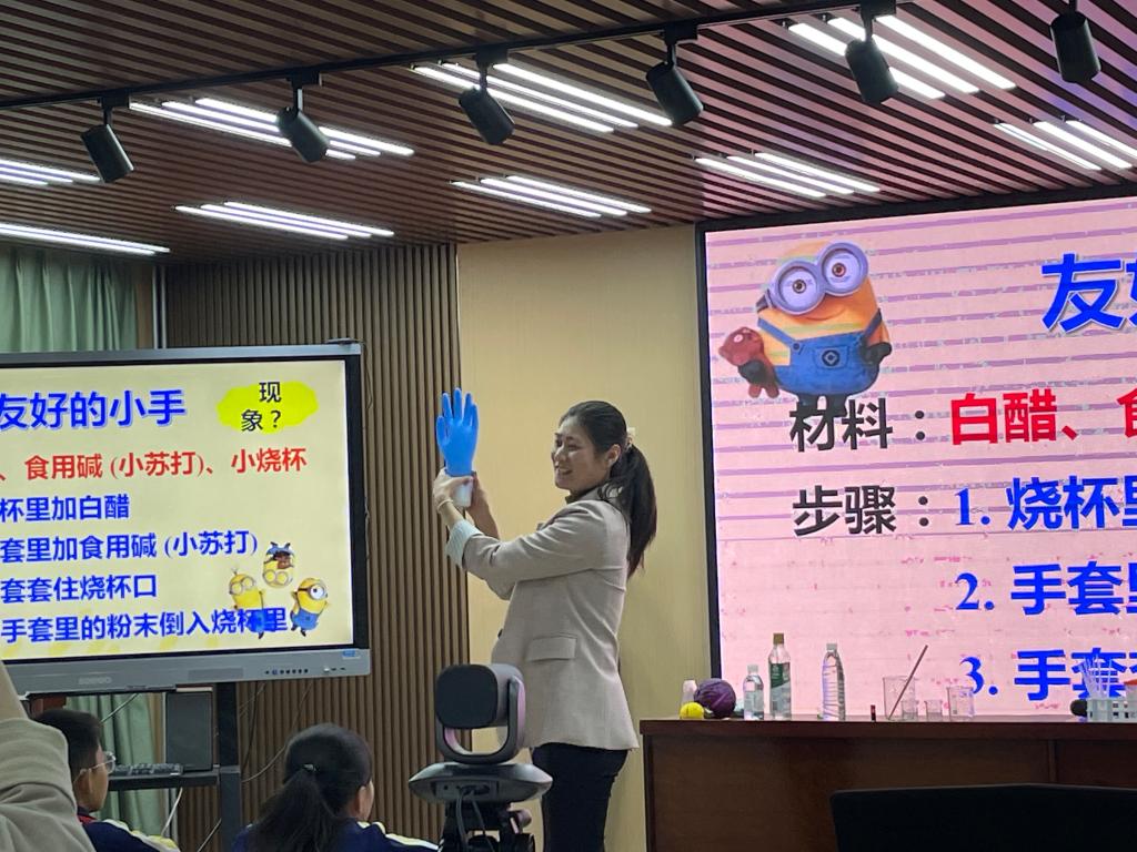 吴令霞老师给同学们带来了《化学变色衍生的生活变色小实验》讲座,通过“友好的小手”实验直观地呈现了白醋与小苏打反应生成二氧化碳,随后,吴老师将紫色石蕊试剂滴入两种反应物,分别变为了蓝色和红色,并邀请现场同学上台进行尝试,并引申出生活中其他常见酸碱指示剂的制备方法、效果及原理,最后又回归到化学在生活中环保、医学等领域的应用。在答疑环节,同学们纷纷踊跃提问,吴老师也一一进行耐心解答。“吴老师好厉害,我也想学习做化学实验,成为像吴老师那样的‘魔法师’!”东胜路小学六年级一班的张同学对吴老师的化学小课堂赞不绝口。