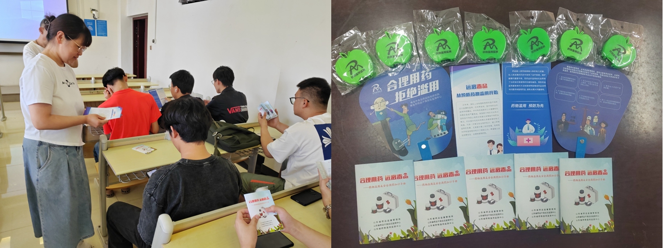 为了让学生们更加直观地了解禁毒知识,活动现场还设置了宣传展板,向大家发放了由青岛市药品不良反应监测中心提供的禁毒知识宣传册和生活用品。