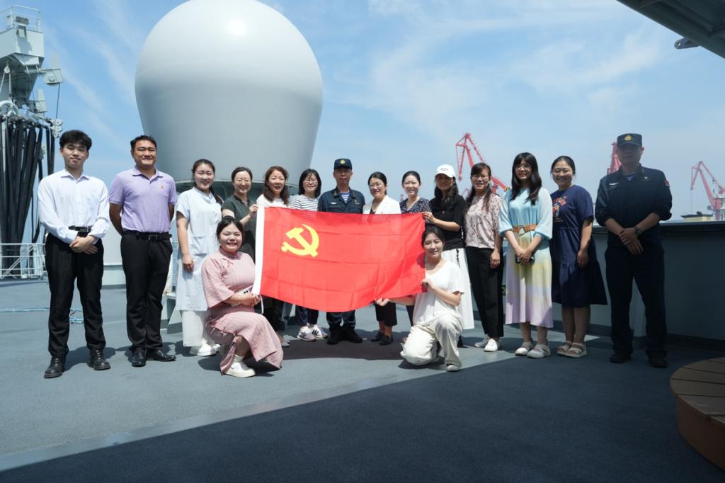 在舰领导的陪同讲解下,师生党员近距离接触驾驶室、手术室、阅览室等船舱内部设备装置,深切领会新时代海军“向战而行向海图强”的精神要义与战略内涵,饱览现役舰艇的雄伟风采。学生代表们演唱经典红歌《想家的时候》《红旗绣》,表达对舰艇官兵的崇高敬意。