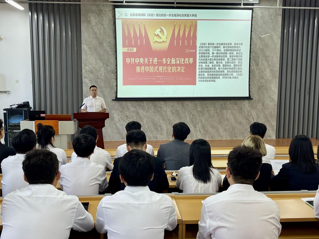 为促进青年团员领悟全会精神,提高思想觉悟意识,团委组织学生组织、各班级团支部认真学习宣传贯彻党的二十届三中全会精神。党委副书记董虎面向全体学生骨干开展宣讲,他指出,党的二十届三中全会强调了改革的重要意义,作为学生骨干,要勇于创新,做时代的开拓者。既要有自强不息的奋斗精神,又要有创新驱动的改革意识,敢打“头阵”、争做“主角”,主动投身国家事业发展大潮之中,脚踏实地、苦干实干。