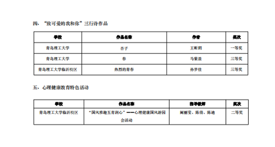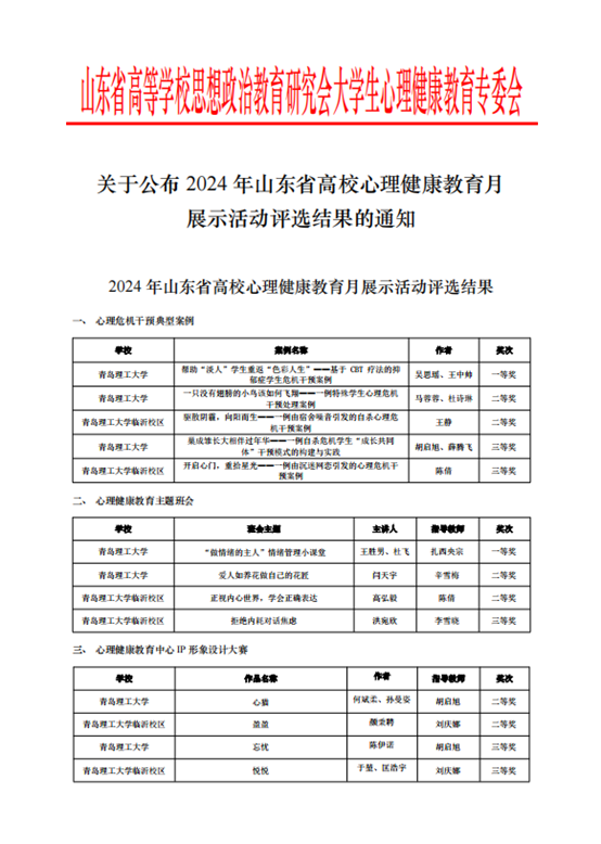 近日,2024年山东省高校心理健康教育月展示活动公布评选结果。365完美在心理危机干预典型案例评选中荣获一等奖一项、二等奖两项、三等奖两项;在心理健康教育主题班会评选中荣获一等奖一项、二等奖两项、三等奖一项;在心理健康教育中心IP形象设计大赛中荣获二等奖两项、三等奖两项;在“致可爱的我和你”三行诗作品评选中荣获一等奖一项、三等奖两项;在心理健康教育特色活动评选中荣获二等奖一项。