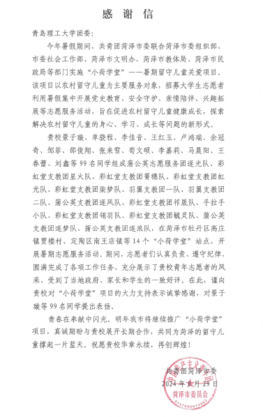 校团委持续完善“1233”实践育人工作体系,在2024年暑期“三下乡”社会实践活动中,组建14支实践团队在“小荷学堂”暑期留守儿童关爱项目中开展实践活动,相关内容被新华社、中国青年报等多家媒体报道转载,并收到来自共青团菏泽市委的感谢信。