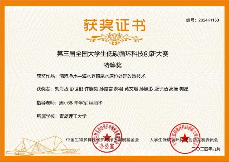 近日,第三届全国大学生低碳循环科技创新大赛决赛在杭州圆满落幕,环境与市政工程学院研究生刘海丞、彭世俊等10位同学(指导教师:周小琳、毕学军、程丽华)的参赛作品《清澄净水——海水养殖尾水原位处理改造技术》荣获全国特等奖。