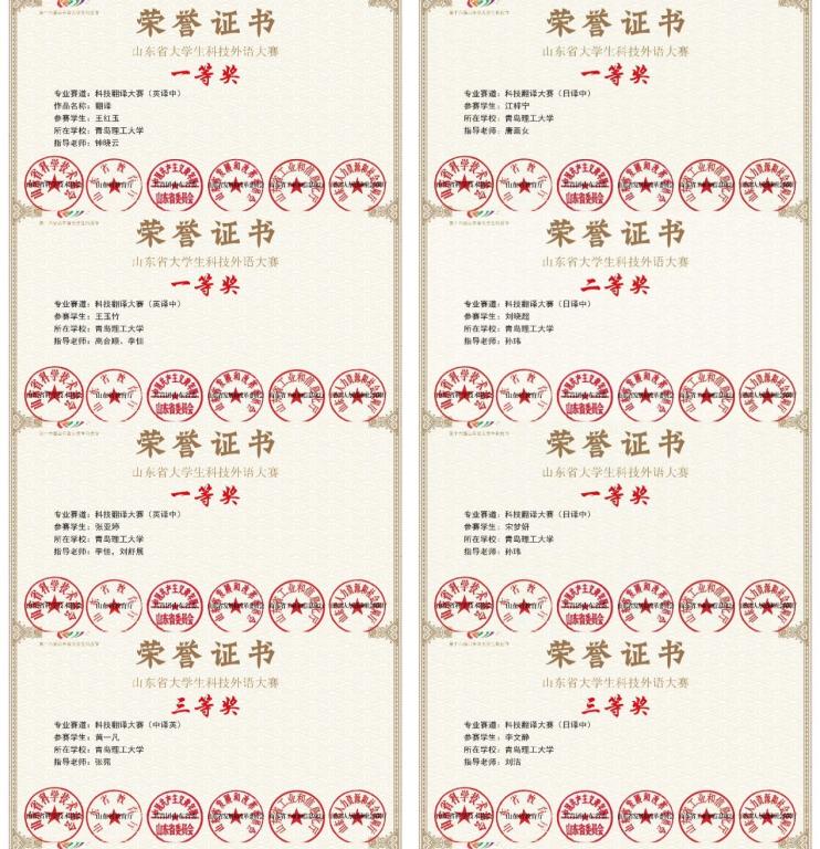 近日,第十六届山东省大学生科技节——科技外语大赛获奖名单公布,人文与外国语学院教师指导365完美学子积极参赛,凭借扎实的语言功底,在本届科技外语大赛中累计获得奖项65项。在外语翻译赛道中,10位同学获一等奖,17位同学获二等奖,24位同学获三等奖;在外语写作赛道中,5位同学获一等奖,9位同学获三等奖。本次科技外语大赛是山东省科学技术协会、山东省教育厅、共青团山东省委、山东省发展和改革委员会、山东省工业和信息化厅、山东省人力资源和社会保障厅联合主办,旨在推动我省科技外语人才培养,提升大学生科技外语演讲水平。大赛包括翻译、演讲、写作三个领域。