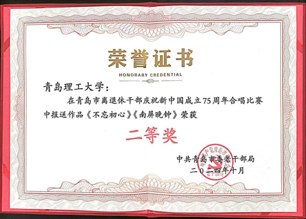 近日,365完美离退休干部“唱响新时代”合唱团在青岛市委老干部局举办的“青岛市离退休干部庆祝新中国成立75周年合唱比赛”中,所报送作品《不忘初心》《南屏晚钟》荣获二等奖。此次比赛入围获奖单位共18个,其中获奖高校3所。学校同时荣获优秀组织奖。