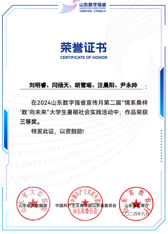 近日,省大数据局、共青团山东省委、省教育厅联合组织开展了第二届“情系桑梓‘数’向未来”大学生暑期社会实践活动评选情况。土木工程学院学生调研报告《数智引领,绿色赋能》(指导教师:王俊富)获省级三等奖,调研报告《数字赋能:沂源县宏观数字建设实践研究》(指导教师:左安源)获省级优秀奖。