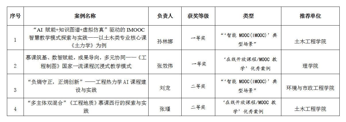 其中张效伟老师的《慕课筑基、数智赋能,成果导向,多元协同——<工程制图>国家一流课程沉浸式教学模式》和孙林娜老师的《“AI 赋能+知识图谱+虚拟仿真”驱动的IMOOC 智慧教学模式探索与实践——以土木类专业核心课<土力学>为例》分别获得在线开放课程/MOOC教学优秀案例一等奖和“智能MOOC(IMOOC)”典型场景优秀案例一等奖。