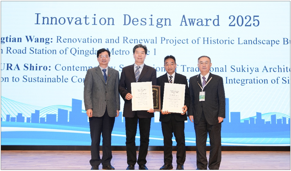 在本届大会的设计奖项评选中,建筑与城乡规划学院名誉院长王兴田教授,凭借主持完成的“青岛地铁1号线中山路站历史景观建筑更新改造项目”,荣获“亚洲城市环境学会2025年度创新设计奖(Innovation Design Award 2025)”。王兴田教授长期致力于城市历史街区保护与建筑更新领域的研究与实践,强调“在传承中创新、在更新中延续”的设计哲学,为推动中国城市更新理论和实践发展作出突出贡献。该项目以“传承与再生”为核心理念,融合历史建筑保护与现代交通设施建设,在尊重历史文脉的基础上,注入绿色建造、生态景观与公共艺术元素,实现了城市遗产保护与现代功能更新的有机融合,成为青岛城市更新与文化传承的典范。