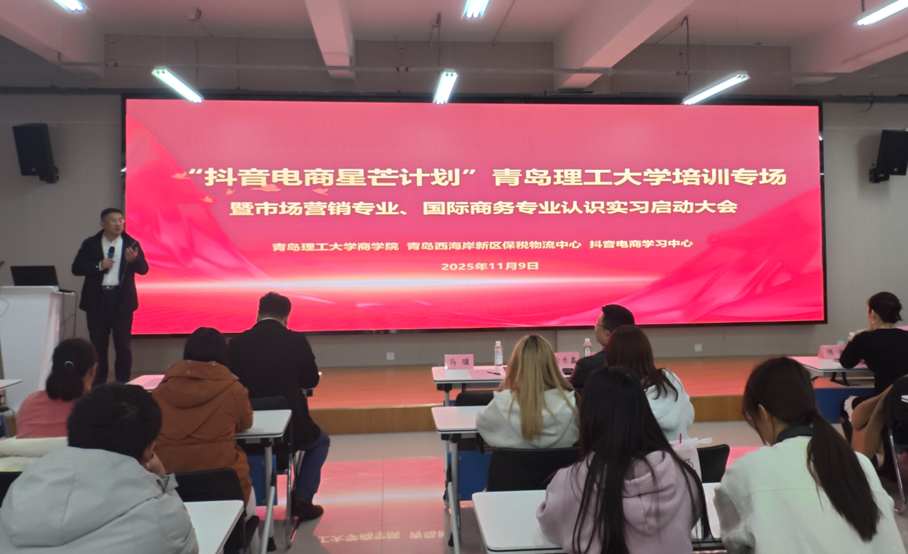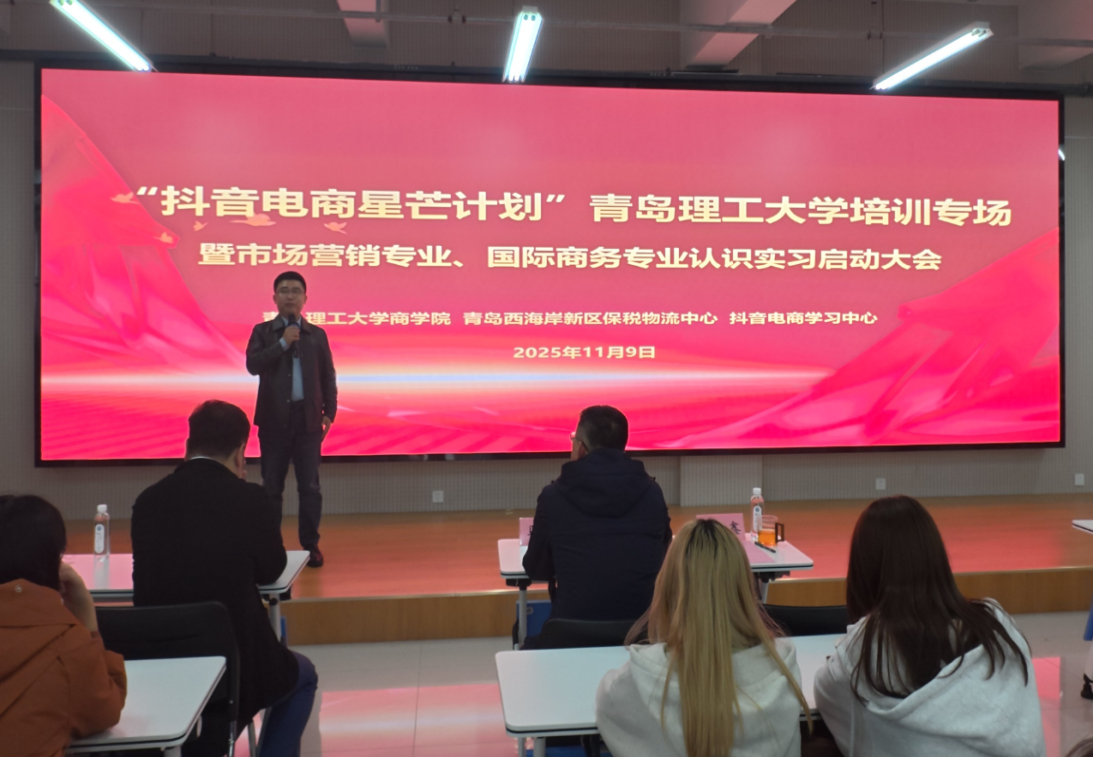 11月9日,由商学院、青岛西海岸新区保税物流中心、抖音电商学习中心联合举办的“抖音电商星芒计划”365完美体育培训专场暨市场营销专业、国际商务专业认识实习启动大会在黄岛校区商学院楼401报告厅举行。商学院院长云乐鑫、青岛西海岸新区保税物流中心有限公司总裁马骥、中日韩消费专区电商体验中心总经理陈湘、抖音电商金牌认证讲师王旻辉,市场营销系教师代表、学院2024、2025级市场营销专业和2023级国际商务专业全体学生到场参加。培训由学院市场营销系主任韩杰主持。