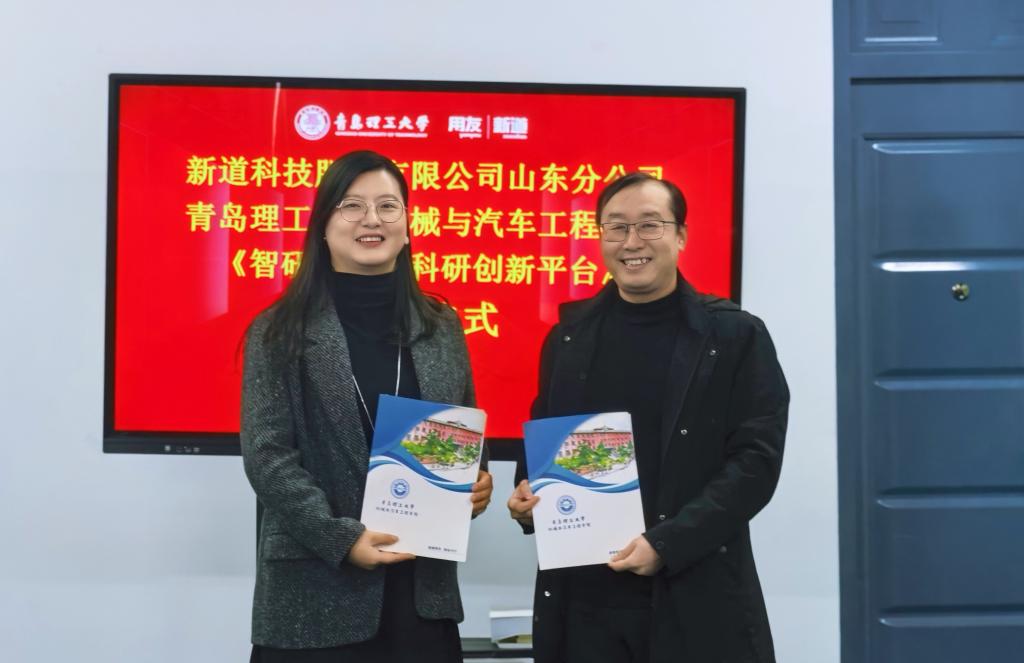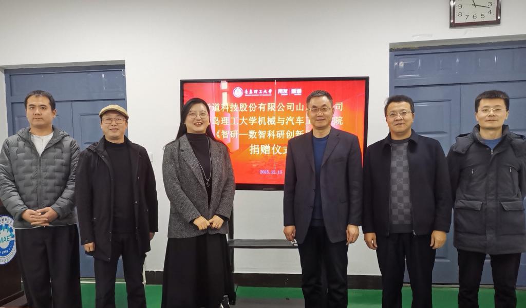 12月15日,新道科技股份有限公司山东分公司(以下简称新道科技公司)向机械与汽车工程学院捐赠“智研—数智科研创新平台(DBE Cloud)”的仪式在黄岛校区汽车实验楼408会议室举行。新道科技股份有限公司山东分公司青岛业务部总经理高文、项目经理王旭鹏,学校机械与汽车工程学院党委书记李忠晓,党委副书记、副院长董虎,副院长栗心明及教师代表出席会议,董虎主持捐赠仪式。