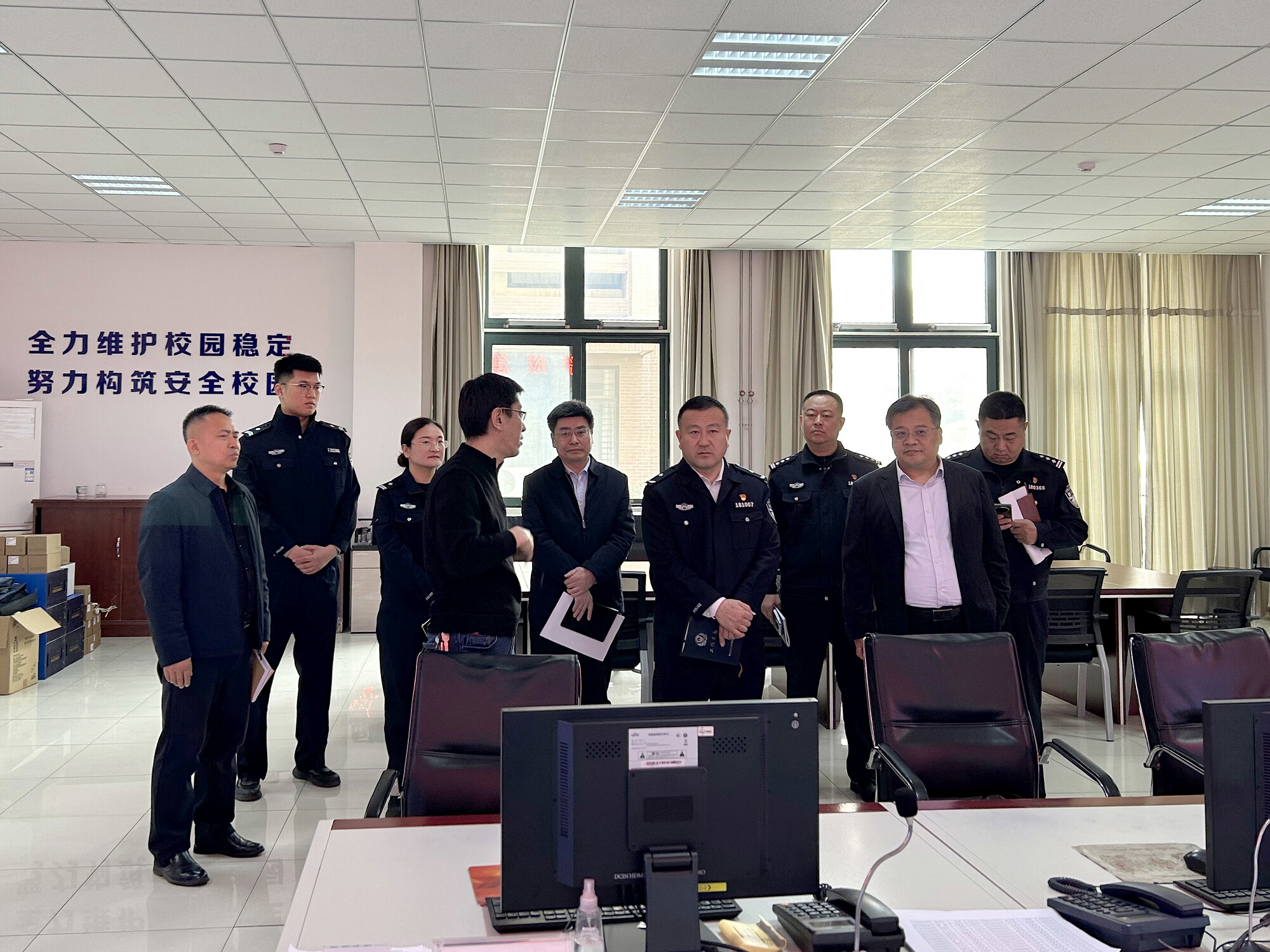 宋善鹏副局长一行参观了学校应急指挥中心,看望了驻校民警,实地查看了学校门口交通拥堵情况,现场会商优化措施,并表示要组织专业力量进行实地勘察和调研,尽快拿出切实可行的解决方案。(撰稿:申维东;摄影:姜圣天;审核:李国涛)