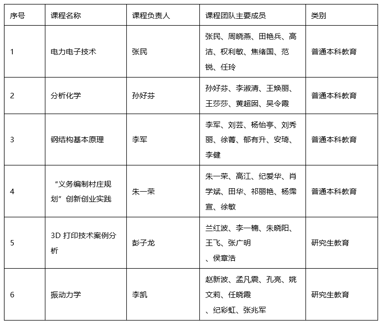 2023年11月,学校根据山东省教育厅《山东省教育厅关于开展2023年省级课程思政示范项目(普通本科教育、研究生教育)建设工作的通知》要求,分别由教务处、研究生院牵头,广泛动员、精心组织,经过前期动员申报、资格审核与专家评审,进行省级课程思政示范课程项目申报推荐,最终获批立项6门山东省普通高等教育课程思政示范课程,分别是张民老师的《电力电子技术》(国家一流课程)、孙好芬老师的《分析化学》(国家一流课程)、李军老师的《钢结构基本原理》(省一流课程)、朱一荣老师的《“义务编制村庄规划”创新创业实践》(国家一流课程)、彭子龙老师的《3D打印技术案例分析》(山东省优质研究生专业学位教学案例库)、李凯老师的《振动力学》(山东省优质研究生课程)。