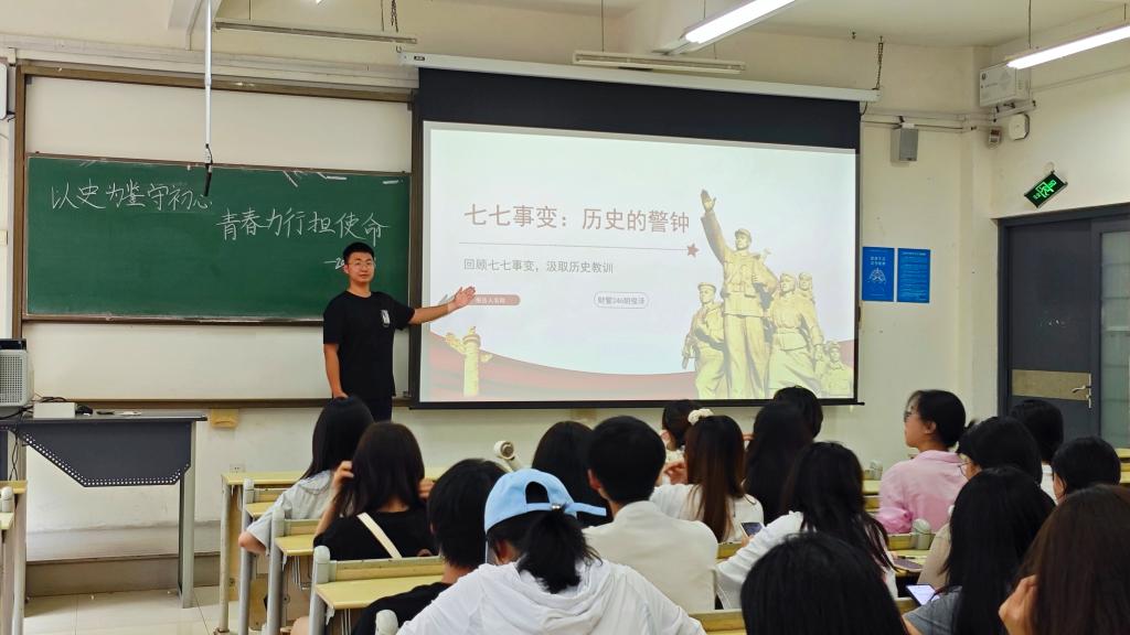 7月4日,商学院志愿服务与社会实践中心与青芒志愿服务社团共同举办“铭记历史,砥砺前行”主题活动。财管246胡俊泽通过时间轴线梳理、历史文献研读等方式,带领青年学子重温“七七事变”。活动中,同学们将感悟化作文字,一张张承载着深沉思考与青春誓言的感悟卡贴满纪念墙,“以史为鉴,吾辈自强”的铿锵承诺跃然纸上。