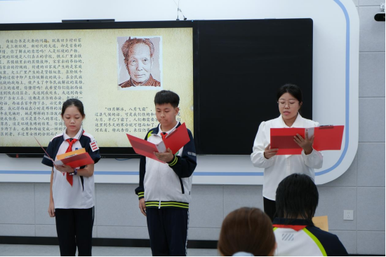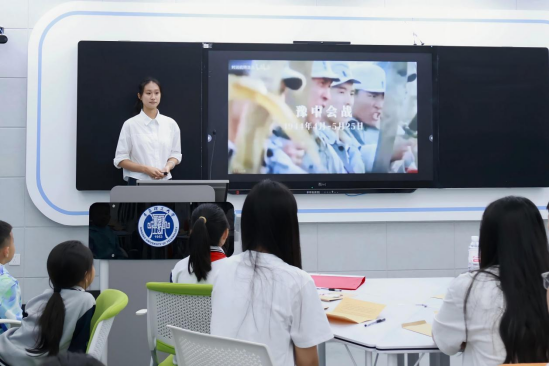 “抗战是我们伟大的母亲,她正在产生新的中国、新的民族、新的人民……”家书誓言的领读,正式拉开了思政课的帷幕。思政课聚焦抗战英雄王孝慈的英勇事迹,通过分学段领读、事迹讲解、互动分享等形式,共同感受抗战精神穿越时空、叩击心灵的力量。学生们在领读环节后纷纷表示,革命英雄即便与家人天各一方,字里行间仍是国家安危重于泰山的坚定信念令人动容。