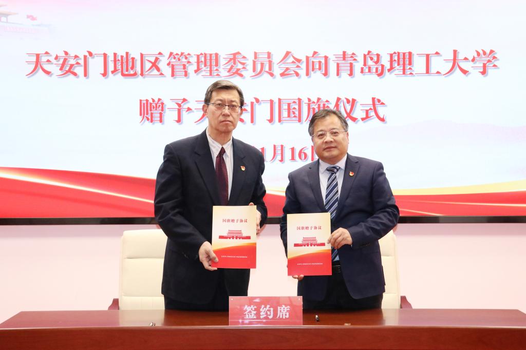 赠旗仪式庄严隆重。北京市人民政府天安门地区管理委员会党组成员、副主任姚辉赠予国旗,学校党委副书记车景华接受赠予。双方签订《国旗赠予协议》。北京校友会副会长刘景涛见证国旗赠予全程。