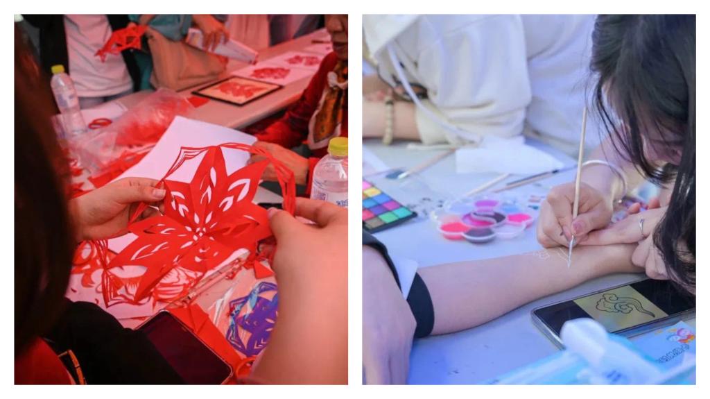 “零距离”观摩,“沉浸式”体验,让同学们兴奋不已。“今天的朋友圈都被游园会刷屏啦!第一次见到了正宗的胶东花饽饽,真的是形象逼真、色彩鲜艳、惟妙惟肖!泊里麦草画让我大开眼界。传统文化的创造力真的是无穷的!”来自贵州遵义的人文与外国语学院石洪欣同学在非遗文化展示区观展时兴奋说道。今天特意穿上汉服的岑杰同学则表示:“汉服穿搭太惊艳啦!今天结识了很多喜欢汉服的朋友,了解了更多关于汉服的知识,不同时代的汉服蕴藏着不同的特色,汉服不仅是一种穿着,更是一种文化的交流和传承。”“今天终于体验了剪纸,一张纸在手里折叠、剪裁,然后变成一幅精美的艺术品,真是美妙的体验!”理学院的康宁同学一边展示她今天跟剪纸传承人一起完成的“大作”一边开心的说道。