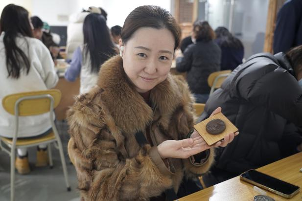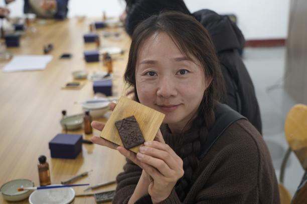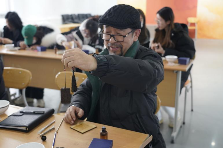 学院邀请了青岛市天恩合香非遗传承人徐红,带领教工一起制作古法香牌。徐红为大家展示了香的使用方式、香文化的历史发展以及香的类别等,让大家徜徉于香文化的前世今生,还特别将“沉、檀、龙、麝”四种名香样品向观众展示,让观众们有了更直观的了解。徐红演示了香牌制作流程,大家细心地将香泥反复搓揉、摔打,使用各式各样的模具,将揉搓好的香泥压入模具中,一块块芬芳浓郁、古色古香的香牌便制作完成。