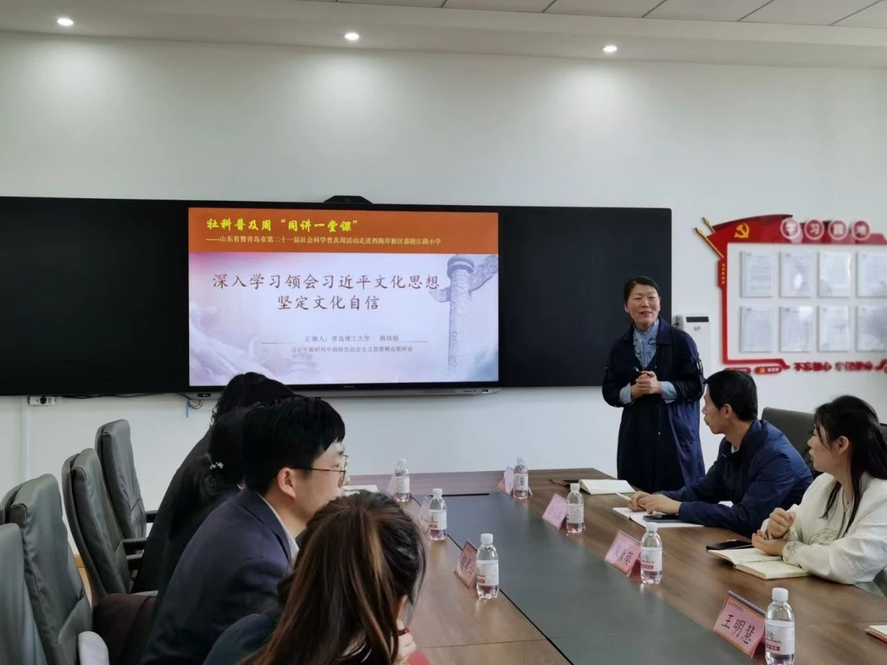 为积极响应青岛市社科联第二十一届社会科学普及周“同讲一堂课”的活动号召,5月16日,马克思主义学院习近平新时代中国特色社会主义思想概论教研室在人文社科处的组织下,教研室主任薛伟娟博士走进青岛西海岸新区嘉陵江路小学,开展“深入学习领会习近平文化思想,坚定文化自信”宣讲活动,嘉陵江路小学校长李晓丽与党员教师参加本次活动。