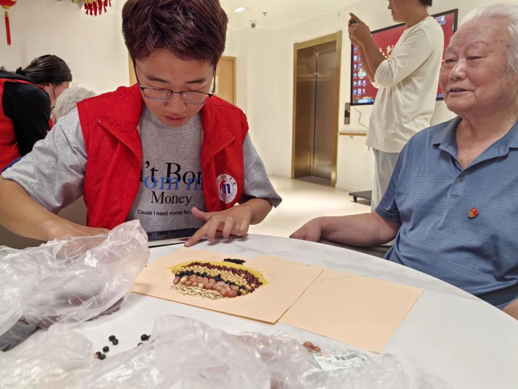 金秋送爽,五谷安康。学生们为老人们准备了手工材料,拉直花柄、涂上胶水、组上花托、等待风干,一朵朵手工花便陈列而出。学生们还和老人们共同制作五谷杂粮画,用不同的谷物作为颜料,在纸张上组装不同的图画。摊纸、涂胶,再以黑米、小米打底,然后依次铺上红豆、黄豆、黑豆、花生,燕麦,一副“五谷丰登碗”便制作完成了。思源社负责人王娅涵同学说:“在手工制作中,我感受到长辈们的热情,这让我体会到了中华传统美德的力量。”