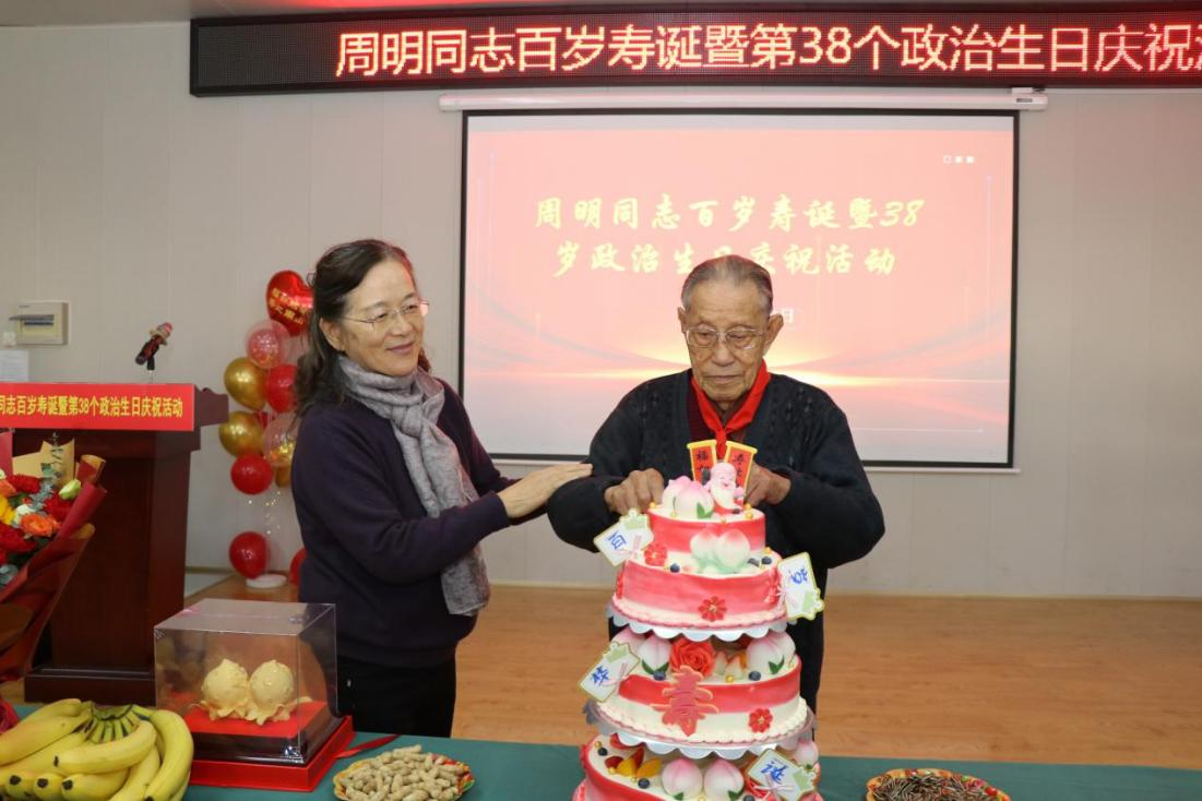 12月11日,离退休党委联合学校组织部举办退休老干部周明老师百岁寿诞暨第38个政治生日庆祝活动。机关党委书记兼组织部副部长乔海涛,青岛市市北区阜新路街道党工委委员、人大工作委员会主任赵书芬,南宁路社区党委书记兼居委会主任赵月龙,私立青岛大路小学党支部书记兼校长夏青,以及周明所在的市北退休一支部的老同志代表出席本次活动。活动由学校离退休党委书记李洪民主持。